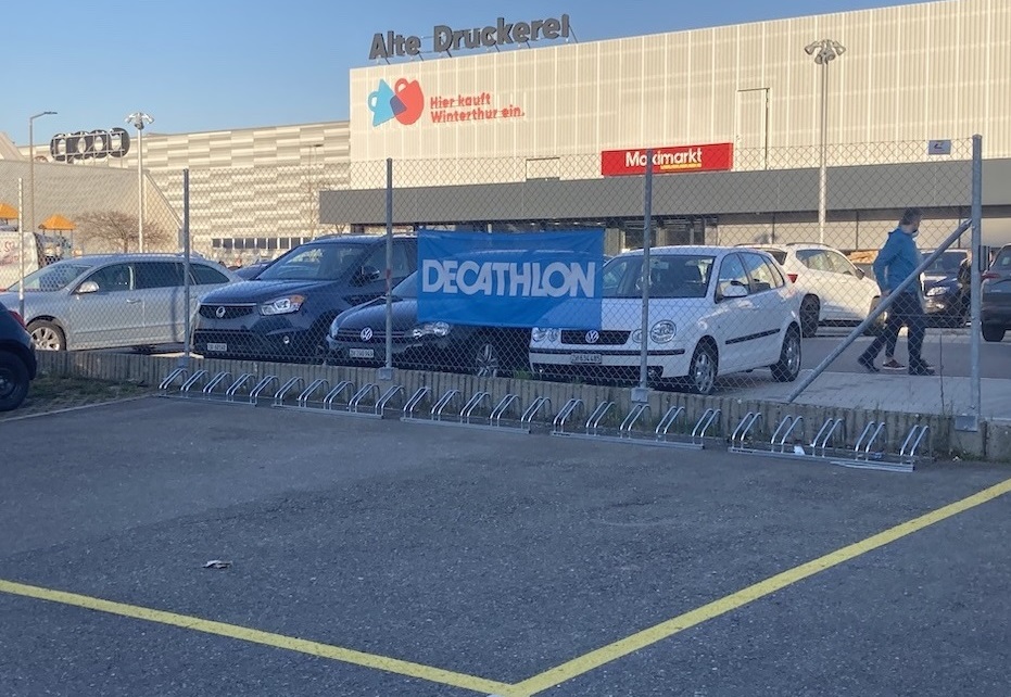 Untaugliche Ständeranlage (klassische „Bögliständer“ wie in den 70er-Jahren), kein Schutzdach und weit entfernt vom Eingang. Test im Velojournal 3-2021