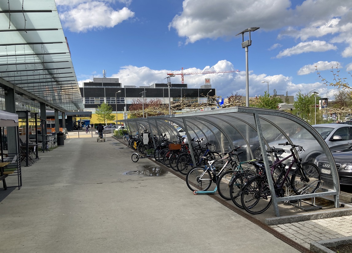 Ausreichend Abstellplätze sind vorhanden, allerdings unnötig weit vom Eingang entfernt. Velos mit Anhänger versperren den Passanten den Weg. Test im Velojournal 4-2021