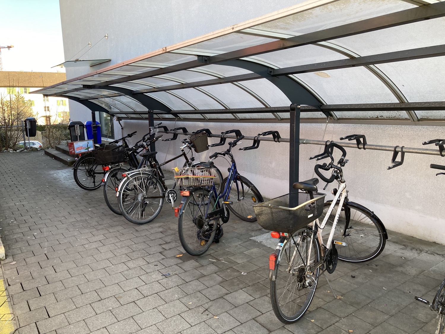 Stufenfreie Zufahrt, überdachte Anlage nahe beim Eingang. Vorrichtung zum Einhängen der Velolenker mangelhaft. Test im Velojournal 2-2021